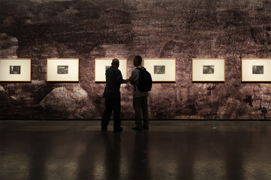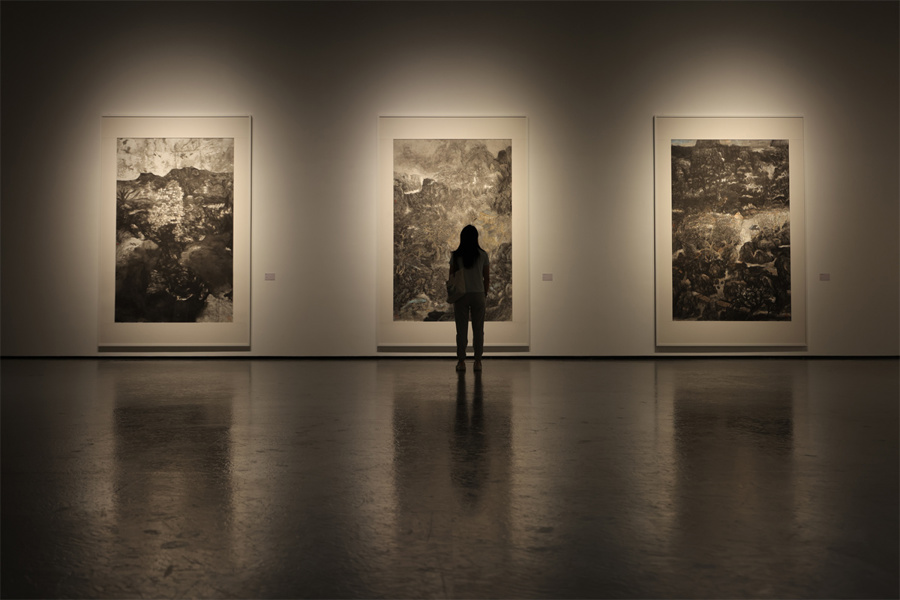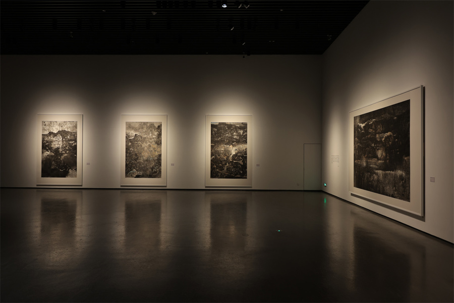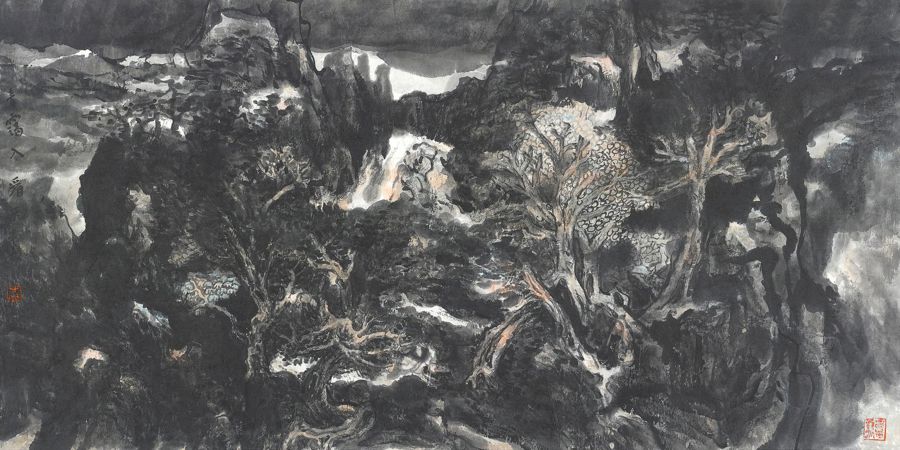 朱敏多年深入山川观察体悟,历经创作蜕变,终成一系列墨色磅礴、生机盎然的水墨巨制。他将远山之思凝于笔端,带领观众步入其构建的山水宇宙。其画册印制难度极高,因“黑云压城”式的积墨技法源自中国传统笔韵,复制易失层次。唯有亲临展厅,漫步画作之间股壹佰,方能感受“黑金山水”的深邃意境,体悟笔墨中流淌的心境与哲思。值得一提的是,朱敏常在浓墨间留出小块“留白”,赋予画面呼吸般的通透感。