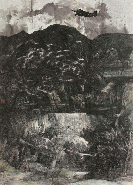 步入展厅,首件作品即为2015年荣获上海“白玉兰”美术大奖的《驼峰岁月》。朱敏坦言,此作是其四十余年国画创作实践的重要突破,在图式、笔墨技法与意象空间处理上均进行了大胆探索。画面墨色雄浑润泽,仿佛自然之声流动其间,引发观者对英雄主义的无限遐想——作品描绘支援中国的运输机穿越喜马拉雅山隘,最终冲破云海的壮阔场景。