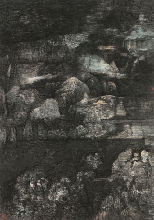 朱敏强调,其钟爱的“黑金山水”以墨为主,通过层层叠加追求极致的黑与浑厚。在2003年作品《无言的山》前,他阐释:“他人画山,是让观众以目力攀登;我愿绘的是海底之山,更沉静、更神秘,需与观者一同‘深潜’。”